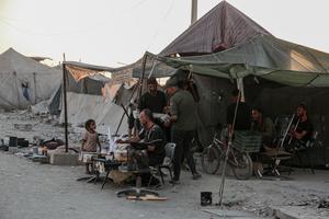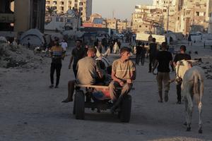 (251008) -- GAZA, 8 octubre, 2025 (Xinhua) -- Imagen del 7 de octubre de 2025 de palestinos vistos en una...
