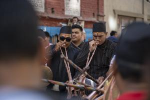 (251008) -- KATMANDU, 8 octubre, 2025 (Xinhua) -- Personas con atuendos tradicionales participan en un desfile musical durante una celebración...