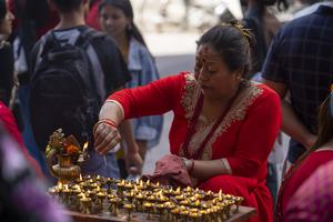 (251008) -- KATMANDU, 8 octubre, 2025 (Xinhua) -- Una mujer ofrece lámparas de mantequilla durante una celebración del festival Hadigaun,...