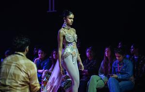 (251009) -- NUEVA DELHI, 9 octubre, 2025 (Xinhua) -- Una modelo presenta una creación de la marca india Enamor durante...