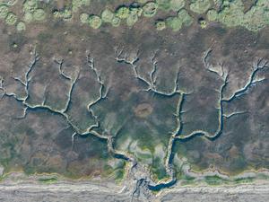 (251012) -- JIAXING, 12 octubre, 2025 (Xinhua) -- Vista aérea tomada con un dron el 11 de octubre de 2025 de una llanura de marea después del retroceso de la marejada del río Qiantang, en la ciudad de Haining, en la provincia de Zhejiang, en el este de China. La marejada del río Qiantang, famosa por su altura y velocidad, es una atracción turística tradicional en la provincia de Zhejiang. Cada año, olas gigantes rompen en las orillas del río, cerca de la ciudad de Haining. Tras el reflujo de la marea, aparecen diferentes patrones con forma de árbol en la llanura de marea. (Xinhua/Xu Yu) (rtg) (da)