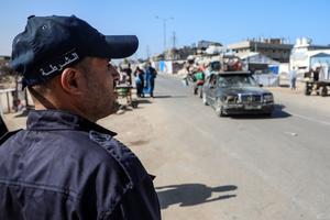 (251012) -- GAZA, 12 octubre, 2025 (Xinhua) -- Imagen del 11 de octubre de 2025 de un miembro de las fuerzas policiacas palestinas visto en una calle en el campamento de refugiados de al-Nuseirat, en el centro de la Franja de Gaza. El acuerdo de alto el fuego entre Israel y Hamás entró en vigor el viernes. (Xinhua/Rizek Abdeljawad) (rtg) (da)
