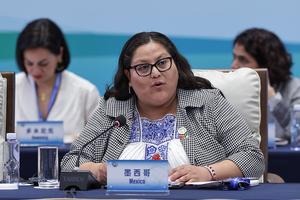 (251013) — BEIJING, 13 octubre, 2025 (Xinhua) — Citlalli Hernández Mora, secretaria de las Mujeres de México, asiste a la reunión plenaria de la Conferencia de Líderes Mundiales sobre la Mujer, en Beijing, capital de China, el 13 de octubre de 2025. (Xinhua/Zhang Yuwei) (rtg) (ah) (ce)