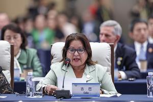 (251013) -- BEIJING, 13 octubre, 2025 (Xinhua) -- Teresa Amarelle, secretaria general de la Federación de Mujeres Cubanas, asiste a la reunión plenaria de la Conferencia de Líderes Mundiales sobre la Mujer, en Beijing, capital de China, el 13 de octubre de 2025. (Xinhua/Zhang Yuwei) (rtg) (ah) (ce)
