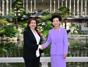 (251013) -- BEIJING, 13 octubre, 2025 (Xinhua) -- La consejera de Estado china, Shen Yiqin, también presidenta de la Federación Nacional de Mujeres de China, se reúne con la subsecretaria general de la ONU y directora ejecutiva de ONU Mujeres, Sima Bahous, quien se encuentra aquí para asistir a la Conferencia de Líderes Mundiales sobre la Mujer, en Beijing, capital de China, el 13 de octubre de 2025. (Xinhua/Gao Jie) (rtg) (ah) (ce)