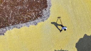 (251011) -- BEIJING, 11 octubre, 2025 (Xinhua) -- Vista aérea tomada con un dron el 11 de octubre de 2025 de un agricultor esparciendo arroz para secar, en el municipio de Lanjiang, en la ciudad de Changning, en la provincia de Hunan, en el centro de China. (Xinhua/Zhou Xiuyuchun) (oa) (da)