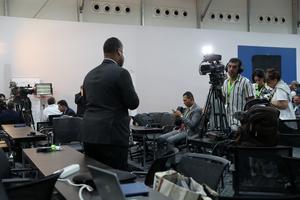 (251013) -- SHARM EL-SHEIKH, 13 octubre, 2025 (Xinhua) -- Periodistas trabajan en el centro de medios de la sede de la cumbre para consolidar el alto el fuego entre Israel y Hamás, en Sharm el-Sheikh, Egipto, el 13 de octubre de 2025. Una cumbre para poner fin a la guerra de Gaza comenzó el lunes en Sharm el-Sheikh y fue copresidida por el presidente egipcio, Abdel-Fattah al-Sisi, y su homólogo estadounidense, Donald Trump. (Xinhua/Sui Xiankai) (rtg) (ah) (vf)