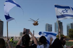 (251013) -- PETAH TIKVA, 13 octubre, 2025 (Xinhua) -- Personas festejan mientras el helicóptero que transporta a los rehenes liberados llega a un hospital, en Petah Tikva, Israel, el 13 de octubre de 2025. El Ejército israelí anunció el lunes que todos los rehenes vivos restantes retenidos por Hamás en Gaza ahora están en Israel, mientras el país ha comenzado a liberar a prisioneros palestinos. (Xinhua/Chen Junqing) (rtg) (ah) (ce)