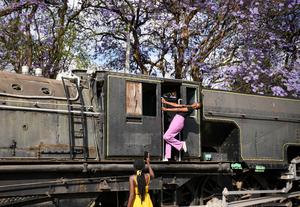 (251013) -- NAIROBI, 13 octubre, 2025 (Xinhua) -- Imagen del 12 de octubre de 2025 de una mujer posando para una fotografía sobre una vieja locomotora con las jacarandas en flor como telón de fondo, en Nairobi, Kenia. Los árboles de jacaranda en Nairobi están en temporada de floración de septiembre a noviembre de cada año. (Xinhua/Li Yahui) (oa) (ah) (vf)