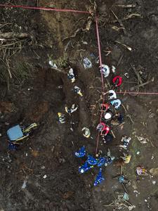 (251013) -- PUEBLA, 13 octubre, 2025 (Xinhua) -- Vista aérea tomada con un dron el 13 de octubre de 2025 de rescatistas realizando trabajos de búsqueda en una zona de un deslizamiento de tierra causado por las lluvias, en Huauchinango, en el estado de Puebla, México. A 64 aumentó el número de personas fallecidas en México por las lluvias e inundaciones registradas entre el 6 y el 9 de octubre pasado en los estados de Veracruz, Puebla, Hidalgo y San Luis Potosí, consideradas las más intensas del año en esa región del país, informaron el lunes las autoridades. (Xinhua/Francisco Cañedo) (fc) (oa) (ah) (vf)