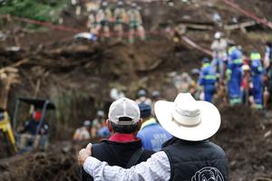 (251013) -- PUEBLA, 13 octubre, 2025 (Xinhua) -- Personas observan los trabajos de búsqueda en una zona de un deslizamiento de tierra causado por las lluvias, en Huauchinango, en el estado de Puebla, México, el 13 de octubre de 2025. A 64 aumentó el número de personas fallecidas en México por las lluvias e inundaciones registradas entre el 6 y el 9 de octubre pasado en los estados de Veracruz, Puebla, Hidalgo y San Luis Potosí, consideradas las más intensas del año en esa región del país, informaron el lunes las autoridades. (Xinhua/Francisco Cañedo) (fc) (oa) (ah) (vf)