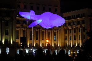 (251011) -- BUCAREST, 11 octubre, 2025 (Xinhua) -- Imagen del 10 de octubre de 2025 de una instalación de arte lumínico que representa una ballena voladora vista durante el Festival Spotlight, en Bucarest, Rumanía. (Xinhua/Cristian Cristel) (oa) (da)