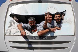 (251014) -- GAZA, 14 octubre, 2025 (Xinhua) -- Imagen del 13 de octubre de 2025 de presos palestinos liberados llegando...