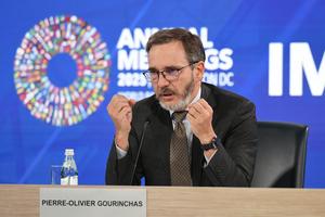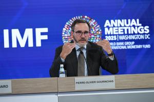 (251014) -- WASHINGTON, 14 octubre, 2025 (Xinhua) -- El economista en jefe del Fondo Monetario Internacional (FMI), Pierre-Olivier Gourinchas, habla...