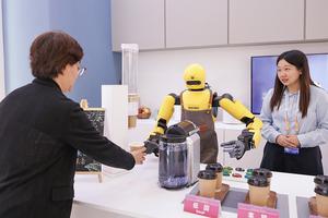 (251014) -- BEIJING, 14 octubre, 2025 (Xinhua) -- Una visitante toma una taza de café preparada por un robot durante...