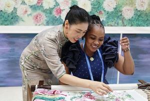 (251014) -- BEIJING, 14 octubre, 2025 (Xinhua) -- Una visitante de Botsuana prueba el bordado chino en una exposición que...