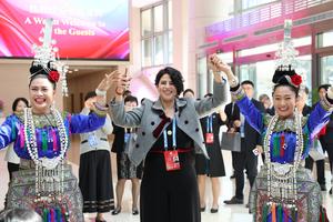 (251014) -- BEIJING, 14 octubre, 2025 (Xinhua) -- Una invitada de Argelia baila con artistas del grupo étnico dong durante...