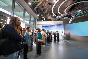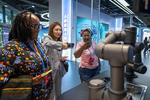 (251014) -- BEIJING, 14 octubre, 2025 (Xinhua) -- Una visitante toma fotografías de una pantalla interactiva con inteligencia artificial durante...