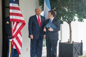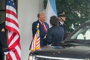(251014) -- WASHINGTON, 14 octubre, 2025 (Xinhua) -- El presidente estadounidense, Donald Trump (i), da la bienvenida al presidente argentino,...