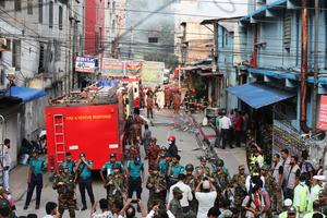 (251014) -- DHAKA, 14 octubre, 2025 (Xinhua) -- Imagen del 14 de octubre de 2025 de bomberos trabajando para extinguir...