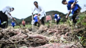 (251015) -- BEIJING, 15 octubre, 2025 (Xinhua) -- Aldeanos cosechan batatas, en la aldea de Gaoxiu del poblado de Linxi, en el distrito autónomo dong de Sanjiang, en la región autónoma zhuang de Guangxi, en el sur de China, el 15 de octubre de 2025. (Xinhua/Zhang Ailin) (jg) (da) (ce)