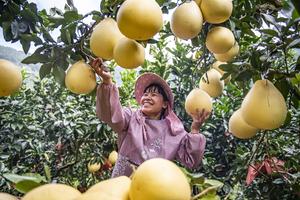 (251015) -- BEIJING, 15 octubre, 2025 (Xinhua) -- Una aldeana cosecha pomelos, en el distrito de Xichou de la prefectura zhuang y miao de Wenshan, en la provincia de Yunnan, en el suroeste de China, el 15 de octubre de 2025. (Xinhua/Xiong Pingxiang) (jg) (da) (ce)