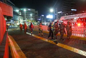 (251014) -- GUAYAQUIL, 14 octubre, 2025 (Xinhua) -- Bomberos trabajan en el lugar donde se registró la explosión de un...