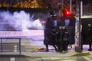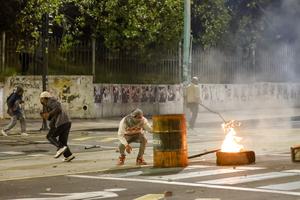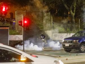 (251015) -- QUITO, 15 octubre, 2025 (Xinhua) -- Un hombre patea una lata de gas lacrimógeno en un enfrentamiento con...
