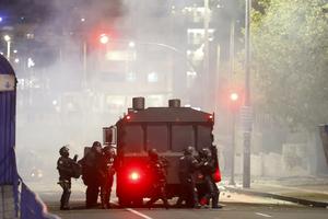 (251015) -- QUITO, 15 octubre, 2025 (Xinhua) -- Un policía dispara gases lacrimógenos en un enfrentamiento con manifestantes durante una...