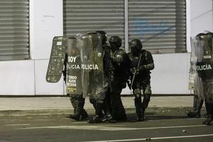 (251015) -- QUITO, 15 octubre, 2025 (Xinhua) -- Policías se cubren en un enfrentamiento con manifestantes durante una protesta en...