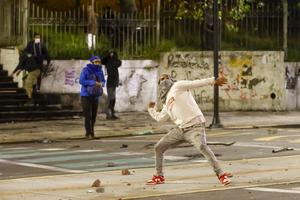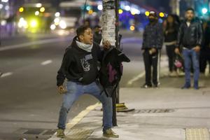 (251015) -- QUITO, 15 octubre, 2025 (Xinhua) -- Un hombre lanza una piedra en un enfrentamiento con policías durante una...