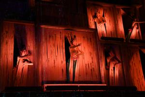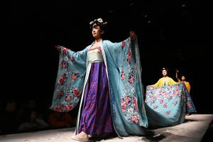(251015) -- DUNHUANG, 15 octubre, 2025 (Xinhua) -- Actrices realizan una presentación durante el drama inmersivo "Encore Dunhuang", en Dunhuang,...