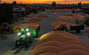 (251015) -- MUDANJIANG, 15 octubre, 2025 (Xinhua) -- Imagen del 14 de octubre de 2025 de agricultores esparciendo maíz recién...
