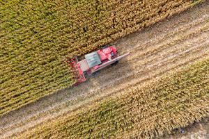 (251015) -- BAYANNUR, 15 octubre, 2025 (Xinhua) -- Vista aérea tomada con un dron de una segadora cosechando maíz, en...