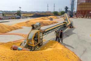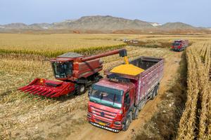 (251015) -- BAYANNUR, 15 octubre, 2025 (Xinhua) -- Un trabajador opera una máquina para transportar el maíz cosechado a la...