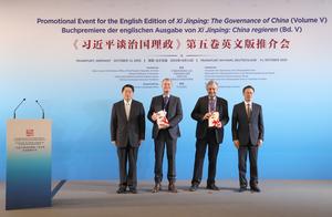 (251015) -- FRANCFORT, 15 octubre, 2025 (Xinhua) -- Los organizadores presentan copias de la versión en inglés del quinto volumen...