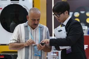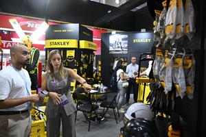 (251015) -- GUANGZHOU, 15 octubre, 2025 (Xinhua) -- Un comprador extranjero (i) visita el estand de STANLEY de Estados Unidos...