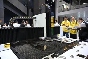 (251015) -- GUANGZHOU, 15 octubre, 2025 (Xinhua) -- Compradores visitan un estand que exhibe máquinas de corte por láser durante...