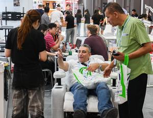 (251015) -- GUANGZHOU, 15 octubre, 2025 (Xinhua) -- Un comprador experimenta una silla ergonómica durante la 138ª edición de la...