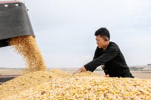 (251015) -- BAYANNUR, 15 octubre, 2025 (Xinhua) -- Un aldeano descarga maíz cosechado, en la bandera frontal de Urad, en...