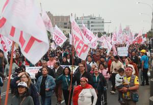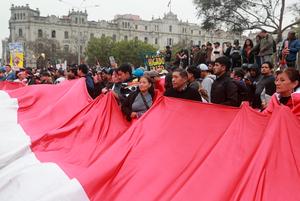 (251016) -- LIMA, 16 octubre, 2025 (Xinhua) -- Imagen del 15 de octubre de 2025 de personas sosteniendo una bandera...