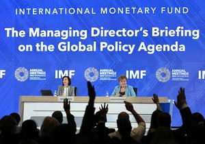 (251016) -- WASHINGTON, 16 octubre, 2025 (Xinhua) -- La directora gerente del Fondo Monetario Internacional (FMI), Kristalina Georgieva (d), responde...