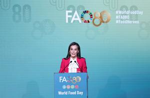 (251016) -- ROMA, 16 octubre, 2025 (Xinhua) -- La reina Letizia de España habla en el evento conmemorativo del Día...