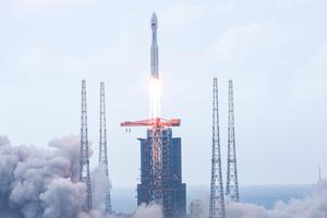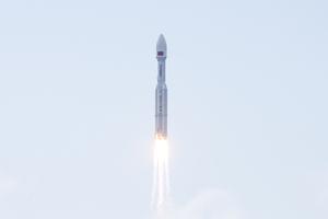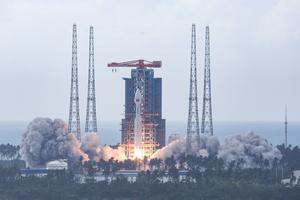 (251016) -- WENCHANG, 16 octubre, 2025 (Xinhua) -- Un cohete portador Gran Marcha-8A transportando el grupo número 12 de satélites...