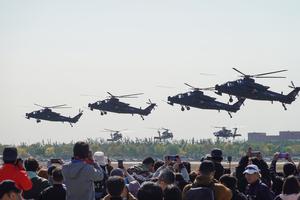 (251018) -- TIANJIN, 18 octubre, 2025 (Xinhua) -- Helicópteros del equipo de acrobacias aéreas Fenglei del Ejército Popular de Liberación...