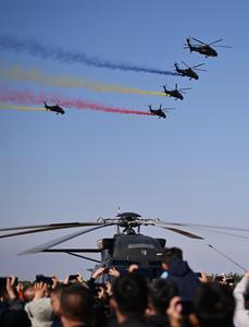 (251018) -- TIANJIN, 18 octubre, 2025 (Xinhua) -- Un helicóptero Z-10 realiza una presentación durante la séptima Exposición de Helicópteros...