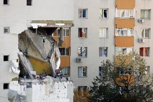 (251017) -- BUCAREST, 17 de octubre de 2025 (Xinhua) -- Un edificio residencial afectado por una explosión es visto en...