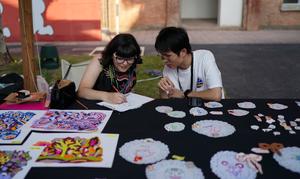 (251018) -- JINGDEZHEN, 18 octubre, 2025 (Xinhua) -- Imagen del 17 de octubre de 2025 de artistas conversando en un...