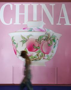 (251018) -- JINGDEZHEN, 18 octubre, 2025 (Xinhua) -- Un visitante camina frente a un cartel que muestra una obra de...