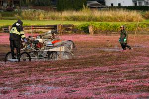 (251018) -- RICHMOND, 18 octubre, 2025 (Xinhua) -- Imagen del 17 de octubre de 2025 de un trabajador cosechando arándanos...
